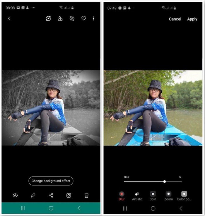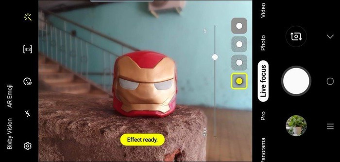 Các hiệu ứng chụp ảnh Live Focus có thể áp dụng theo thời gian thực, tức người chụp có thể chọn bất kỳ hiệu ứng nào trong lúc chụp để xem hiệu ứng có hợp khung cảnh hay không. Tuy nhiên, sau khi ảnh chụp xong người dùng cũng có thể chọn lại hiệu ứng mình thích bằng cách chọn vào Change background effect, sau đó thêm hiệu ứng mình thích. Người sử dụng có thể thay đổi hiệu ứng bất kỳ lúc nào mình muốn.