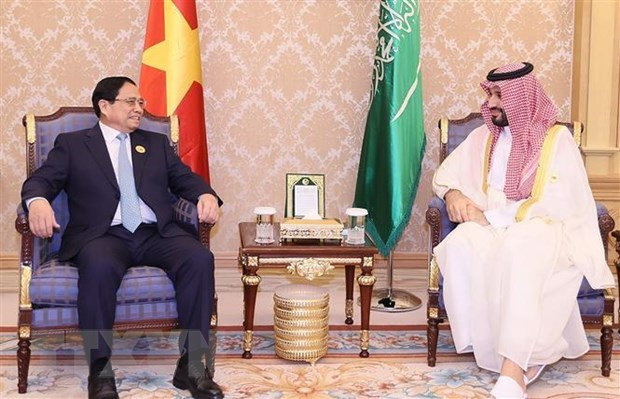 Thủ tướng Phạm Minh Chính gặp Thủ tướng, Thái tử Saudi Arabia Mohammad bin Salman. (Ảnh: Dương Giang/TTXVN)