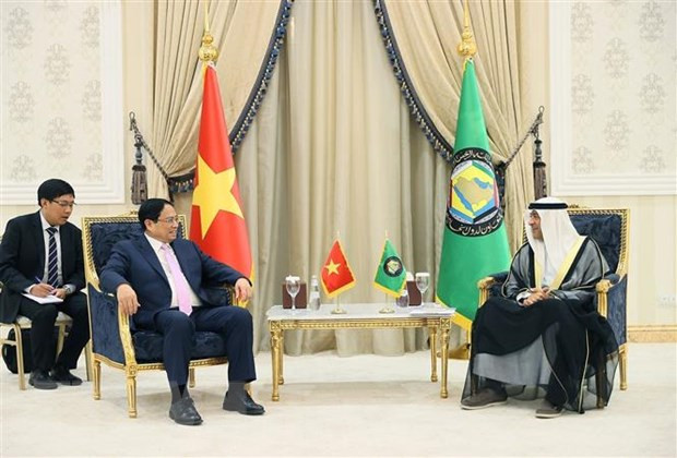 Thủ tướng Phạm Minh Chính làm việc với ông Jassim Muhammad Al-Budaiwi, Tổng thư ký Hội đồng Hợp tác vùng Vịnh (GCC). (Ảnh: Dương Giang/TTXVN)