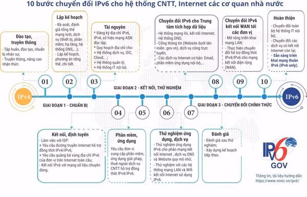 Đối với khối cơ quan nhà nước, công tác chuyển đổi IPv6 ngày càng được đẩy mạnh theo mục tiêu Chương trình chuyển đổi số quốc gia đến năm 2025, định hướng đến năm 2030 và Chương trình IPv6 For Gov giai đoạn 2021 - 2025. Tháng 3/2021, Việt Nam đã có 39 Bộ, ngành, địa phương đã ban hành kế hoạch chuyển đổi IPv6; 14 Bộ, ngành, địa phương chuyển đổi thành công IPv6 cho Cổng Thông tin điện tử - một trong những hệ thống thông tin quan trọng cần ưu tiên chuyển đổi sớm.