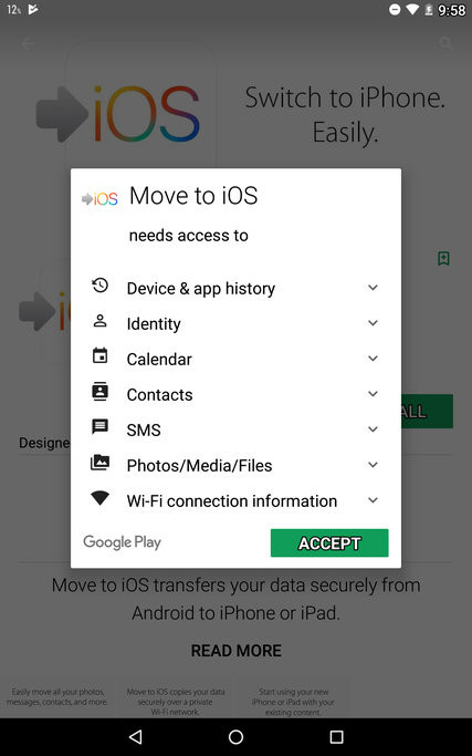 Để chuyển dữ liệu từ thiết bị Android sang iPhone, bạn có thể dùng ứng dụng Move to iOS trên Google Play do Apple phát triển để tự động chuyển danh bạ, lịch, ảnh, video, tin nhắn văn bản, tài khoản mail và đánh dấu trang web sang iPhone, trong khi đó đồng thời cung cấp một danh sách các phiên bản ứng dụng Android cài đặt iOS tương ứng mà bạn có thể tải xuống từ App Store.