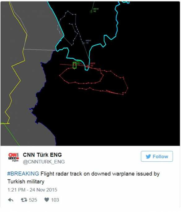 Màu đỏ ghi lại đường bay của Su 24, màu trắng nhạt gi đường bay của F-16. Đường màu xanh sáng là biên giới Syria - Thổ Nhĩ Kỳ