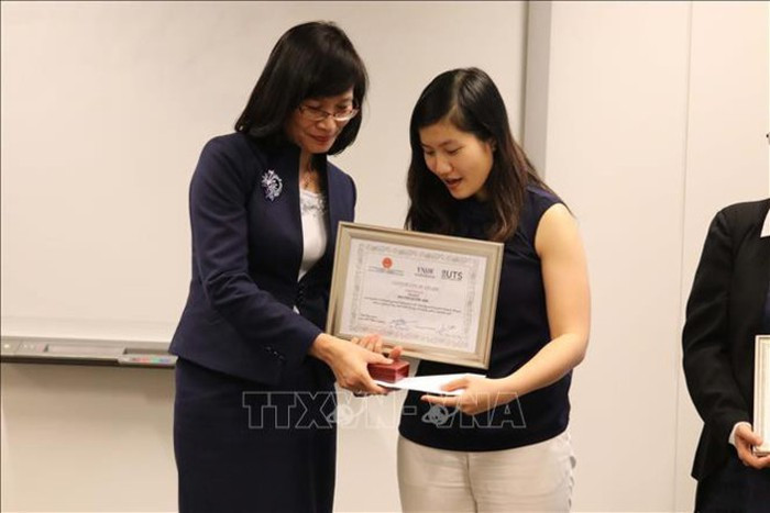 Phó Tổng Lãnh sự quán Việt Nam tại Sydney Nguyễn Thị Minh Nguyệt trao giải nhất cho nghiên cứu sinh Nguyễn Quỳnh Anh với đề tài biến nước thải trong rác thành điện năng sinh học.