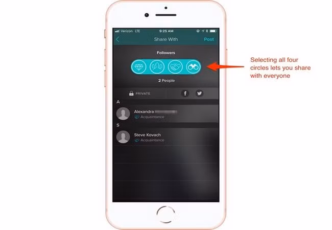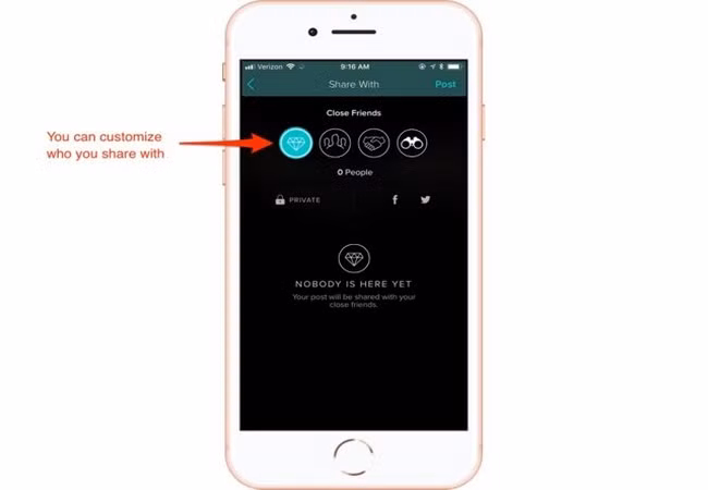 Các dòng đăng của Vero có thể hoàn toàn là riêng tư, hoàn toàn công khai hay được chia sẻ với những nhóm bạn nhất định.