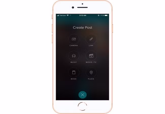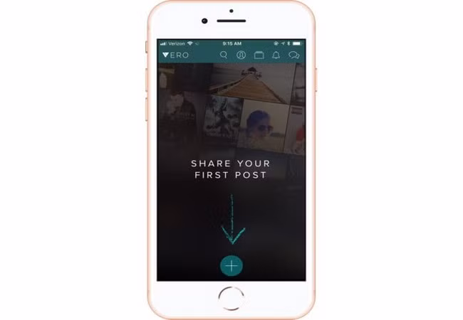 Để chia sẻ một dòng đăng, bấm vào nút “Vero” trên góc trái của màn hình, nút này đưa bạn trở lại với feed của mình. Sau đó, bấm vào nút “+” ở dòng dưới cùng của màn hình.