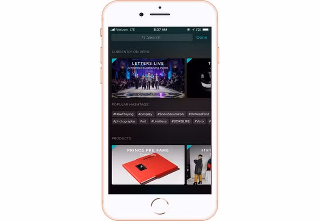 Biểu tượng tìm kiếm của Vero đưa bạn tới một trang tương tự như trên thanh Explore ở Instagram.