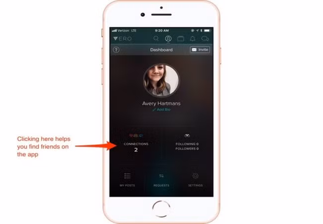 Thanh Dashboard của Vero cho phép bạn xem và thay đổi hồ sơ của mình. Bạn có thể thêm một avatar, viết một đoạn thông tin cá nhân ngắn gọn, và xem các kết nối của mình.