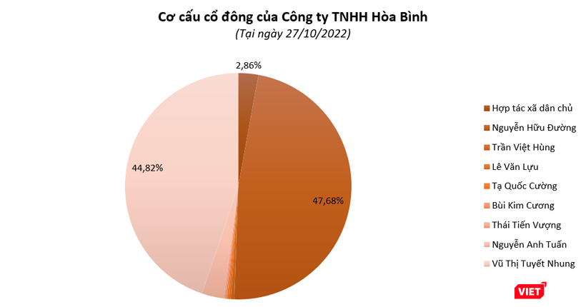 Cơ cấu cổ đông của Hòa Bình Group còn 8 thành viên khác, bao gồm 1 pháp nhân và 7 thể nhân. Trong đó, bà Vũ Thị Tuyết Nhung với phần vốn góp trị giá 493,02 tỉ đồng, tương đương tỷ lệ sở hữu 44,82% vốn điều lệ.