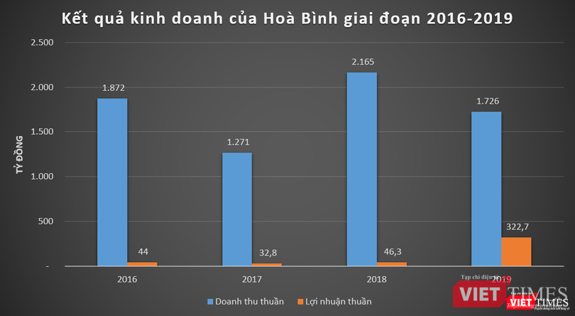 Năm 2019, doanh thu thuần của Hòa Bình đạt 1.726 tỷ đồng, lãi thuần ở mức 322,7 tỷ đồng. Tương ứng, biên lợi nhuận theo doanh thu (ros) đạt mức ấn tượng, xấp xỉ 19%. Tính đến cuối năm 2019, tổng tài sản của Hòa Bình đạt 9.072 tỷ đồng, vốn chủ sở hữu ở mức 953,1 tỷ đồng.