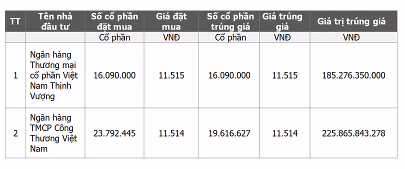 Tham gia phiên đấu giá có 02 nhà đầu tư là Ngân hàng TMCP Việt Nam Thịnh Vượng (VPBank) và Ngân hàng TMCP Công thương Việt Nam (Vietinbank) với tổng khối lượng đăng ký mua là 39.882.445 cổ phần.