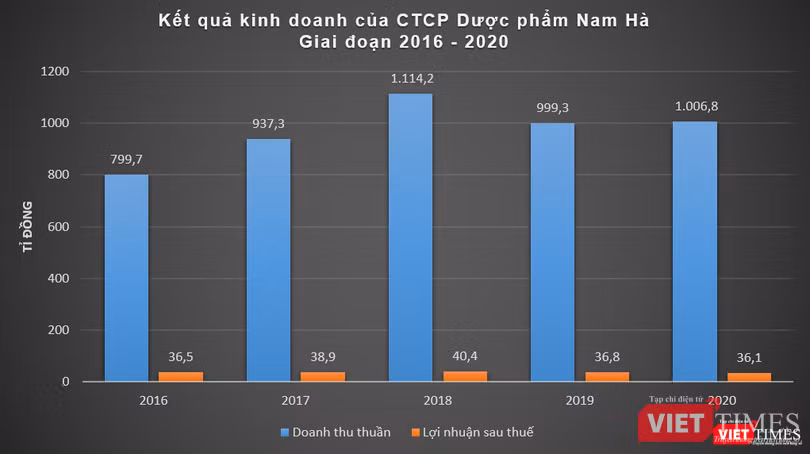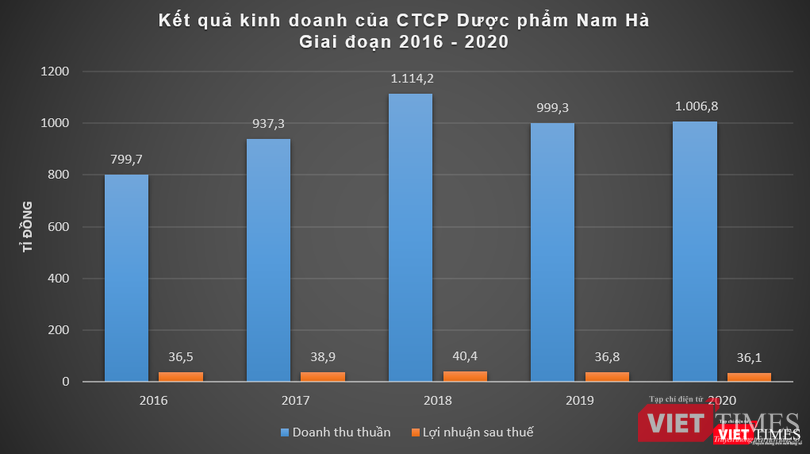 5 năm gần nhất, doanh thu của Dược Nam Hà luôn duy trì trên ngưỡng 1.000 tỉ đồng. Năm ngoái, Dược Nam Hà ghi nhận doanh thu thuần đạt 1.006,8 tỉ đồng, lãi sau thuế ở mức 36,1 tỉ đồng, tương ứng với biên lợi nhuận 3,58%.