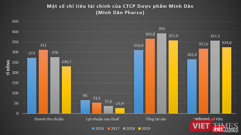 Dữ liệu của VietTimes cho thấy, trong giai đoạn 2016 - 2019, hiệu quả kinh doanh của Minh Dân Pharco có chiều hướng đi xuống, cả về doanh thu và lợi nhuận.