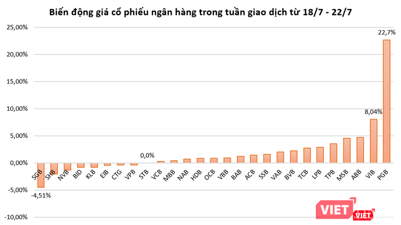 Theo thống kê của VietTimes, trong tuần giao dịch vừa qua (18-22/7/2022), có tới 18/27 mã ngân hàng tăng giá, 1 mã đứng giá và 8 mã giảm giá.