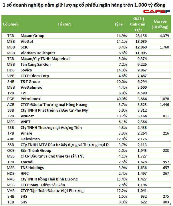 Hiện có rất nhiều doanh nghiệp nắm giữ lượng cổ phiếu ngân hàng lên tới cả chục nghìn tỷ đồng như Masan, Viettel, SCIC, Tổng Công ty trực thăng Việt Nam (Vietnam Helicopter).