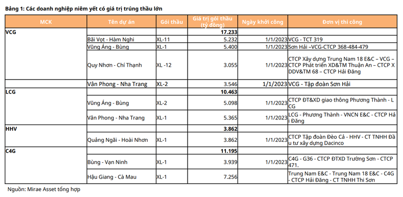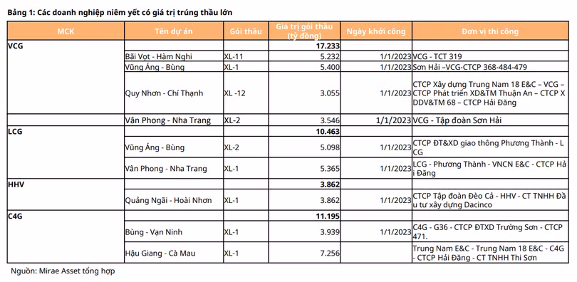 Trong 25 gói thầu các dự án cao tốc đã chọn được nhà thầu, một số doanh nghiệp đang niêm yết cũng trúng các gói thầu có giá trị cao như VCG, LCG, HHV, C4G.