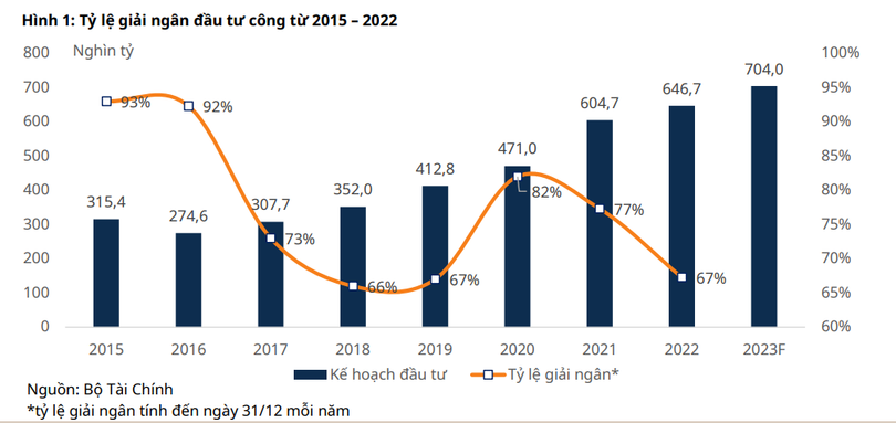 Tuy nhiên, theo số liệu thống kê của Mirae Asset, từ năm 2017 đến nay tỷ lệ giải ngân đầu tư công luôn ở mức thấp, trừ các năm 2020 – 2021 thì việc giải ngân được đẩy mạnh để hỗ trợ hậu quả Covid-19. Điều này cho thấy việc giải ngân đầu tư công giai đoạn vừa qua được giám sát chặt chẽ.