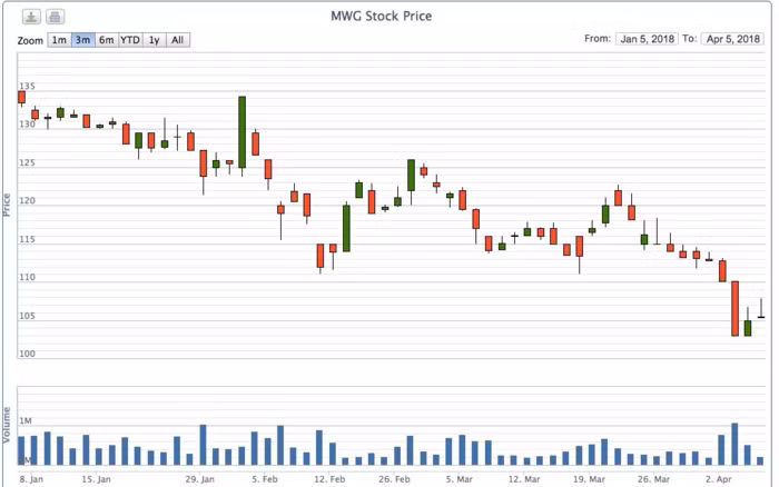 Từ đầu năm 2018, CP MWG có giai đoạn tăng nhưng hầu hết đều giảm. Nhìn biểu đồ giá trong 3 tháng gần đây, những chấm xanh chỉ tồn tại trong 1-2 ngày, còn lại các dấu hiệu đỏ liên tiếp khiến đường biểu đồ càng bị kéo xuống gần với trục ngang hơn. Trong đó, MWG có 7 lần liên tiếp giảm giá kéo dài từ tuần trước đến tuần này, xuống đến mức thấp nhất 103.000 đồng/CP trước khi “xanh” hai ngày gần đây.