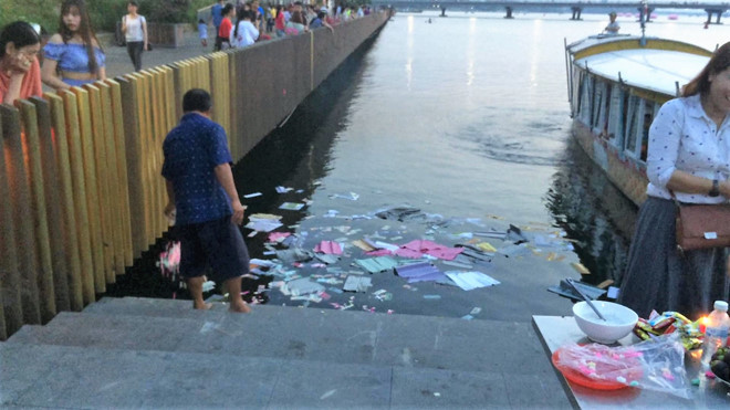 | Sau khi cúng bái, một số người đã ném vàng mã xuống sông Hương gây ô nhiễm môi trường |