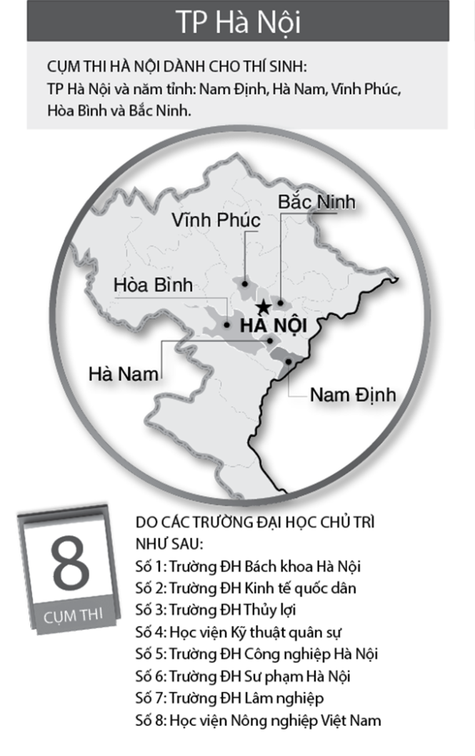 Theo đó, đây là danh sách 38 cụm thi liên tỉnh do ĐH chủ trì mà thí sinh dự thi ở các cụm thi này có thể dùng kết quả vừa xét công nhận tốt nghiệp THPT, vừa xét tuyển vào ĐH, CĐ. Tất cả thí sinh của cụm hợp thành một danh sách thí sinh duy nhất, sắp xếp theo thứ tự A,B,C..., không phân biệt thí sinh thuộc địa phương nào.