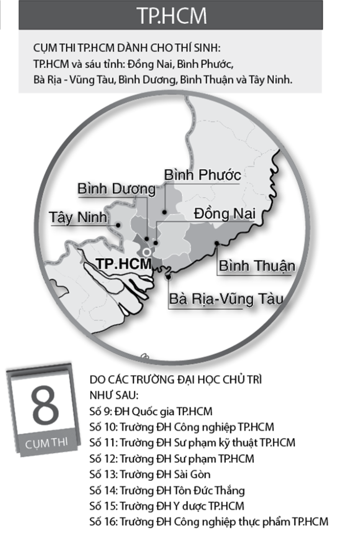 Theo ông Ga, danh sách 38 cụm thi được thiết lập sau khi bộ đã khảo sát, nghiên cứu rất kỹ điều kiện thực tế. Đặc biệt, đối với những vùng khó khăn Tây Bắc, Tây nguyên, Tây Nam bộ, Bộ GD-ĐT đã đến làm việc trực tiếp với các ban chỉ đạo, các địa phương và các trường ĐH liên quan. Riêng TP.HCM trước đây dự kiến có bảy cụm thi, nhưng sau cùng đã quyết định lập tám cụm thi để tránh quá tải cục bộ.