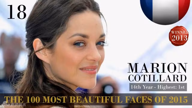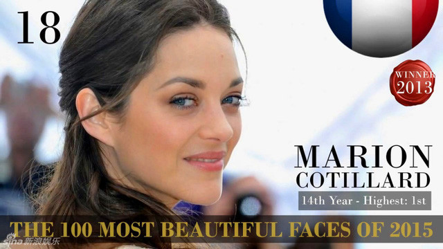 Ngôi sao kỳ cựu của Pháp - Marion Cotillard đứng thứ 18 trong danh sách. Cô đã có 14 lần lọt vào danh sách 100 người sở hữu gương mặt đẹp nhất thế giới và vị trí cao nhất đạt được là số 1.
