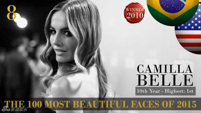 Ngôi sao điện ảnh Camilla Belle đứng thứ 8 trong danh sách. Năm 2015 là năm thứ 10 cô góp mặt vào danh sách 100 gương mặt đẹp nhất thế giới.