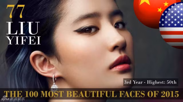 Lưu Diệc Phi của Trung Quốc đứng thứ 77 trong danh sách trong năm thứ 3 được đưa vào danh sách 100 người sở hữu gương mặt đẹp nhất thế giới.