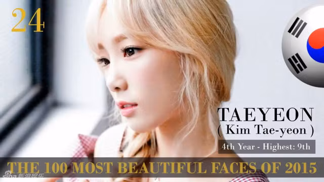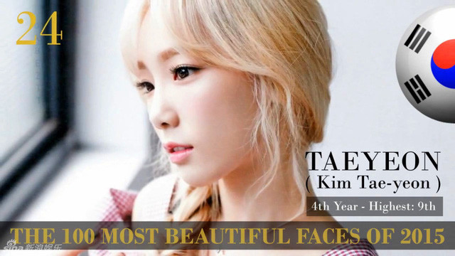 Nữ ca sĩ Tae Yeon lọt thứ 24 trong danh sách 100 nữ nghệ sĩ sở hữu gương mặt đẹp nhất thế giới năm 2015.