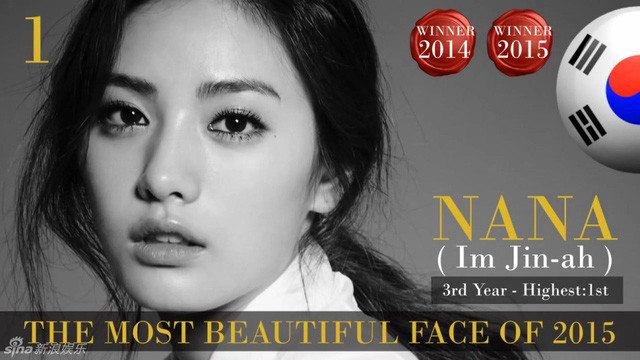 Ca sĩ Hàn Quốc Nana (tên thật là Im Jin Ah) tiếp tục đứng đầu cuộc bầu chọn. Năm ngoái cô cũng được chọn là nữ diễn viên sở hữu gương mặt đẹp nhất thế giới của website này. dẫn đầu danh sách bình chọn của website TC Candler.