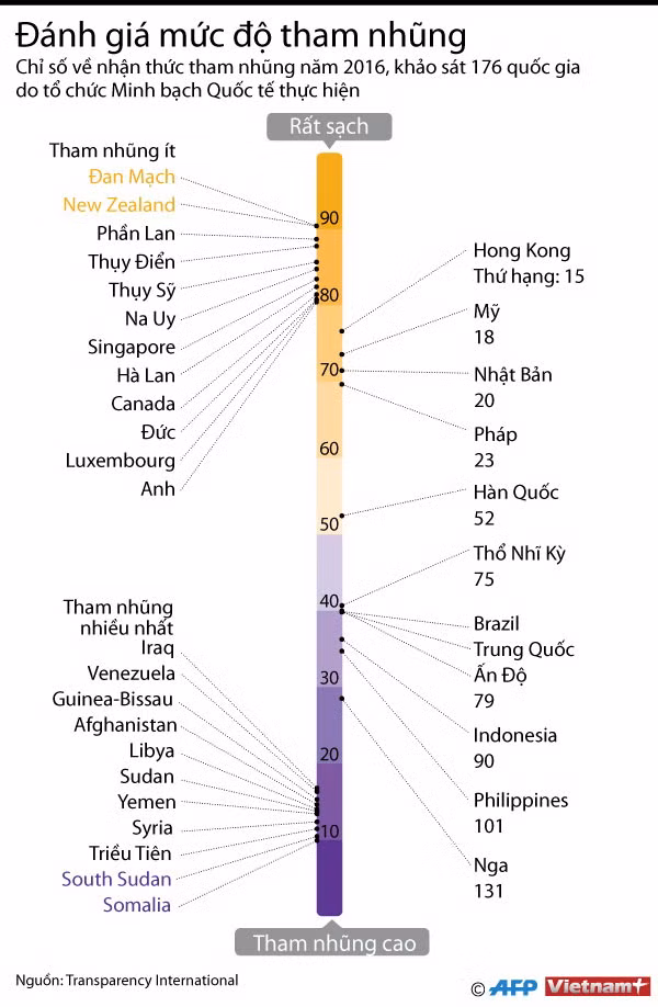 Dựa vào các số liệu từ các tổ chức như Ngân hàng Thế giới (WB), Ngân hàng Phát triển châu Phi và Viện Phát triển Quản lý Quốc tế (IMD) của Thụy Sĩ về chỉ số tham nhũng trong khu vực công như chính phủ, hệ thống pháp luật, các đảng phái chính trị và hành chính công, danh sách của TI được chia theo thang điểm từ 0 (mức độ tham nhũng cao) đến 100 (rất trong sạch)./.