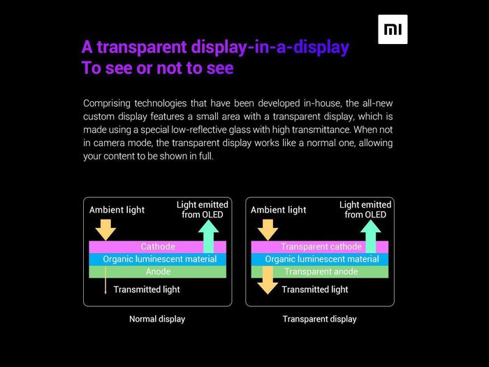 Xiaomi còn lưu ý rằng nhờ việc không cố gắng thu nhỏ kích thước máy ảnh (như trên thiết kế màn hình khuyếthay khoét lỗ), hệ thống màn hình trong suốt cho phép nhà sản xuất trang bị cảm biến lớn - đồng nghĩa với chất lượng ảnh tốt hơn.