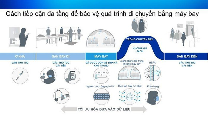 Hành khách khi đến sân bay được yêu cầu xếp hàng giãn cách, đeo khẩu trang và đo thân nhiệt để đảm bảo không có nguồn lây nhiễm đi được vào khu vực sân bay hoặc máy bay. Lớp bảo vệ thứ hai là công tác khử trùng máy bay, giúp đảm bảo rằng tất cả các virus và vi khuẩn dù có đi vào máy bay thì cũng bị tiêu diệt hết trước khi hành khách đi lên máy bay. Ngay cả khi hành khách đã qua được hai lớp bảo vệ đầu tiên thì vẫn có khả năng mang virus và vi khuẩn lên máy bay. Vì vậy, Boeing áp dụng công nghệ lọc không khí hiện đại để đảm bảo nếu có người nhiễm virus ở trên máy bay thì xác suất lây nhiễm cho người khác cũng bị giảm thiểu.