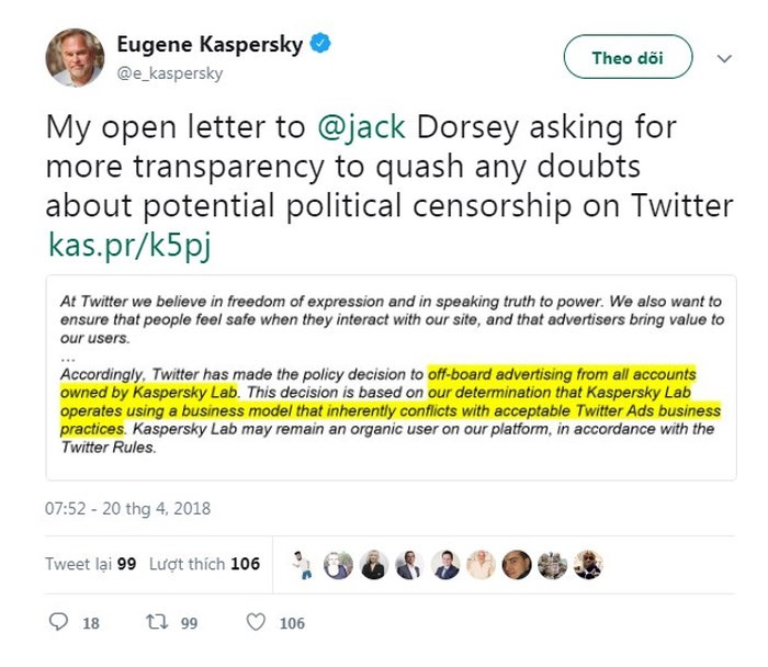 Trong một bức thư gửi tới Kaspersky, Twitter có viết: "Twitter đã đưa ra quyết định loại bỏ tất cả quảng cáo từ các tài khoản thuộc sở hữu của Kaspersky Labs. Điều này dựa trên quyết định của chúng tôi rằng mô hình kinh doanh của Kaspersky Lab xung đột với các chính sách quảng cáo của Twitter".