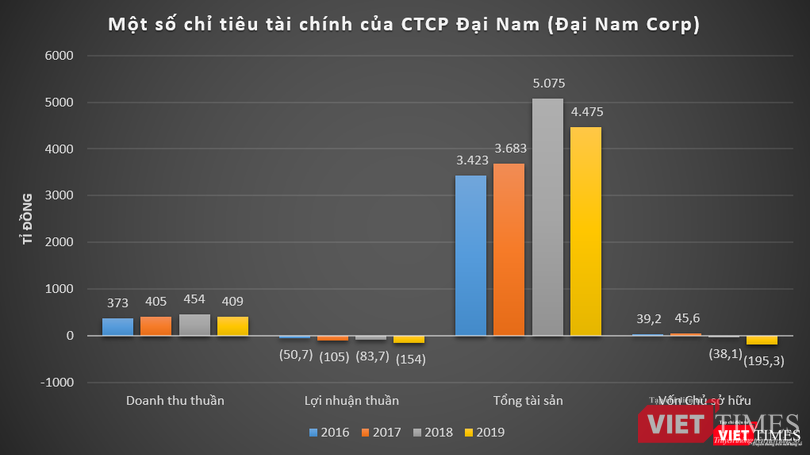 Trong giai đoạn 2016 - 2019, Đại Nam Corp (công ty mẹ) đều đặn ghi nhận doanh thu hàng trăm tỉ đồng mỗi năm. Tuy nhiên, công ty này liên tục báo lỗ với số lỗ cộng dồn 4 năm lên tới hơn 393 tỉ đồng. Riêng năm 2019, Đại Nam Corp báo lỗ 154 tỉ đồng.