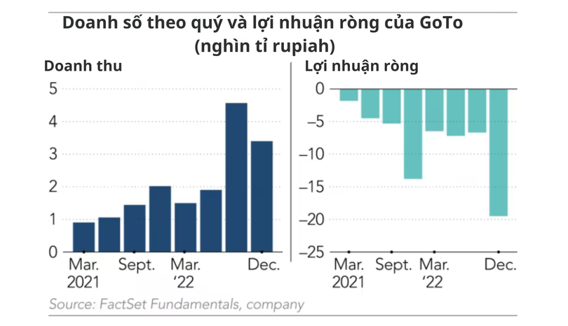 Trong năm 2022, GoTo - công ty mẹ của Gojek - báo lỗ ròng 40.400 tỉ Rupiah (2,7 tỉ USD), tăng 56% so với cùng kỳ năm trước. Nó cao gấp 3 lần so với doanh thu của GoTo - dù doanh thu của công ty này đã tăng gấp đôi so với năm trước, lên mức 11.300 tỉ Rupiah.