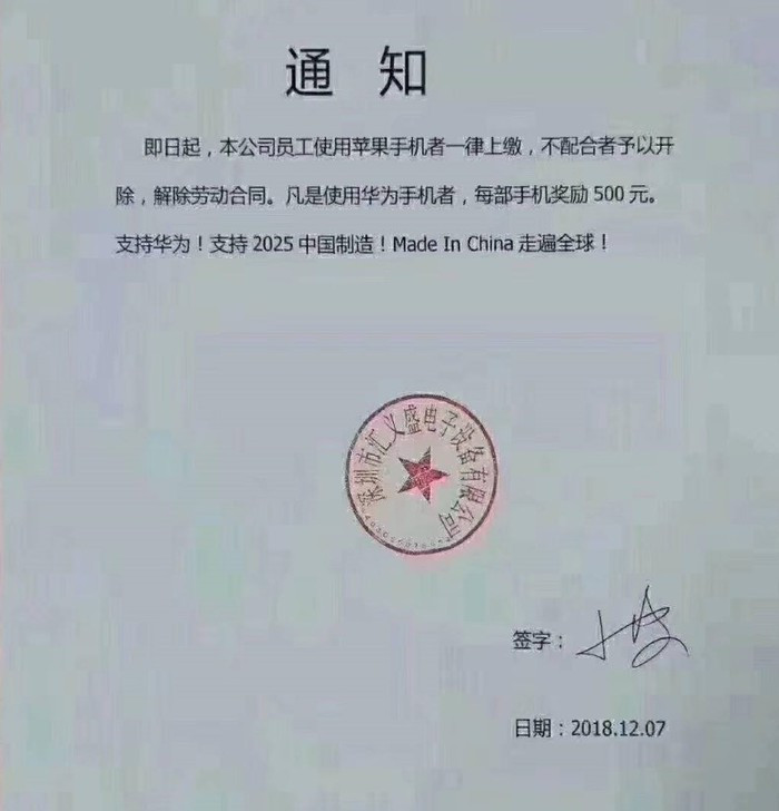 "Tất cả nhân viên sử dụng thiết bị Apple đều phải nộp cho cấp trên, ai không hợp tác sẽ bị đuổi việc, chấm dứt hợp đồng lao động. Người sử dụng điện thoại Huawei sẽ được thưởng 500 nhân dân tệ (tương đương 1,7 triệu đồng) mỗi sản phẩm", trích văn bản từ Công ty TNHH Thiết bị điện tử Hối Nghĩa Thịnh ở Thâm Quyến, Trung Quốc gửi đến nhân viên.