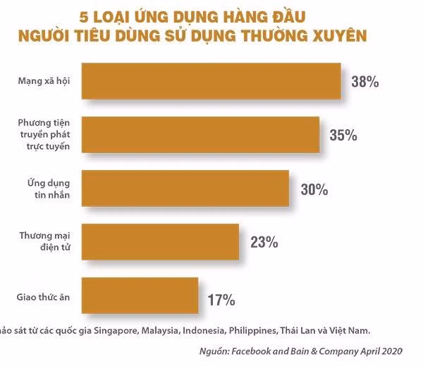 Để tạo nên những bước nhảy vọt này, trước hết là sự xuất hiện số lượng và chủng loại ứng dụng (app). Ở Đông Nam Á trong đó có Việt Nam, những ứng dụng mới xuất hiện trên cả năm công cụ kinh tế số chính là social media, video streaming, instant messaging, eCommerce và food delivery.