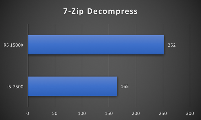 Với các CPU Ryzen, AMD hướng tới tất cả các nhu cầu sử dụng của người dùng chứ không chỉ chơi game. Bởi vậy, làm việc có thể được coi là thế mạnh của dòng CPU này. Dù hiệu năng đơn nhân có chút thua thiệt, số lượng luồng vượt trội của R5 1500X đem lại hiệu năng vượt trội so với các CPU i5 Kaby Lake nói chung và i5-7500 nói riêng dù có thể coi là giá bằng nhau.