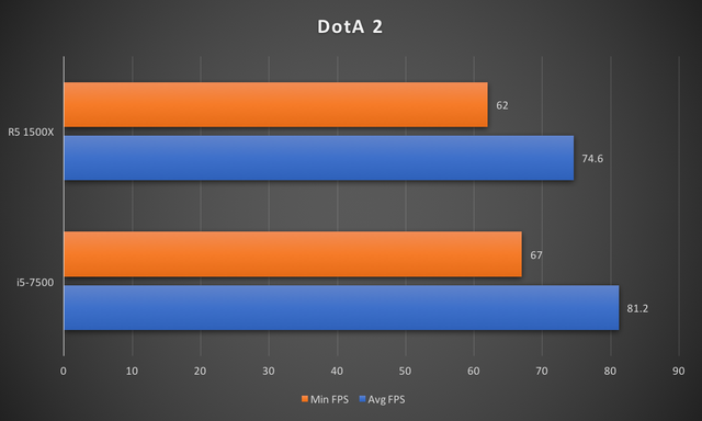 DotA 2, tựa game ARTS sở hữu những giải thưởng hàng chục triệu USD của Valve sau khi được update lên phiên bản 7.00 đã trở thành một tựa game khó nhằn cho các cấu hình tầm trung nếu muốn "max setting". Một điều cần lưu ý nữa là các tựa game của Valve sử dụng engine Source 1 và Source 2 tạm thời có vẻ không ưa Ryzen cho lắm. Chiến thắng cho i5-7500 là một điều gần như hiển nhiên.