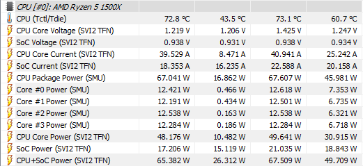 Tiếp bước Ryzen 7, Ryzen 5 một lần nữa đập tan định kiến về việc AMD là phải nóng, phải tốn điện. Chỉ với tản nhiệt stock Wraith Spire, R5 1500X khi chạy hết công suất cũng chỉ có nhiệt độ lên tới 72,8 độ C trong khi ở trạng thái nghỉ, nhiệt độ chỉ ở mức 43,5 độ C. Dù hoạt động vượt mức xung tiêu chuẩn tới 200MHz, điện năng tiêu thụ riêng của CPU vẫn chỉ ở mức 67,7W, gần đúng với mức quảng cáo của AMD.