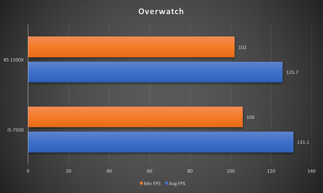 Overwatch là một tựa game bắn súng khác được game thủ trên khắp thế giới ưa chuộng bởi phong cách chơi linh hoạt, kết hợp giữa 2 thể loại FPS và MOBA. Ở bài thử này, i5-7500 có hiệu năng nhỉnh hơn nhờ được tối ưu hoá lâu nay.
