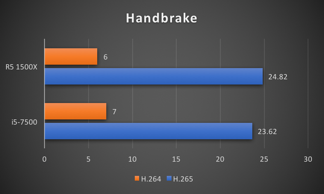 Handbrake là một ứng dụng chuyển đổi dạng mã hoá/giải mã codec video khá được ưa dùng trong các bài thử nghiệm CPU. Khi tính thời gian bằng phút để chuyển sang H.264, một định dạng phổ biến, R5 1500X cho thấy sức mạnh nhỉnh hơn chút xíu, khoảng 12% trong khi lại thua kém khoảng 5% ở định dạng H.265. Đây cũng là điều không có gì khó hiểu khi H.265 hay còn gọi là HEVC là một định dạng rất mới và về cơ bản là sẽ khó lòng được tối ưu hoá cho Ryzen.