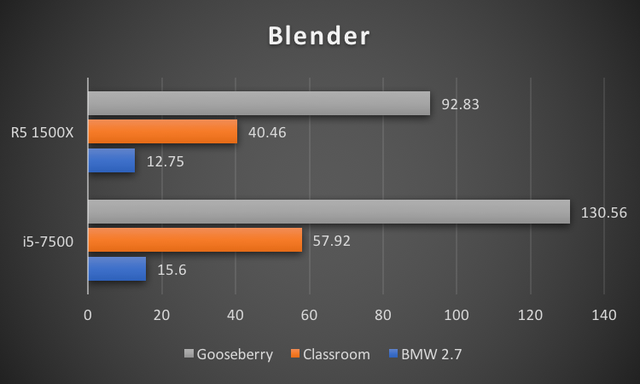 Blender cũng là một ứng dụng dựng hình 3D khá được ưa chuộng khi thử nghiệm CPU. Các thông số ở trên là thời gian để hoàn thành dựng hình, tính bằng phút. Ở cả 3 bài thử tiêu chuẩn của Blender, R5 1500X đều cho thời gian nhanh hơn đến gấp rưỡi.