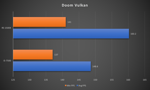 Doom khi chạy bằng thư viện đồ hoạ Vulkan cho thấy lợi thế sân nhà của R5 1500X khi có số khung hình trung bình cao chênh kha khá so với i5-7500. Điều này hứa hẹn một trải nghiệm game mượt mà hơn cũng như sẵn sàng để đá cặp với các màn hình có tần số quét 144Hz, đồ chơi ưa thích của các game thủ mê bắn súng.