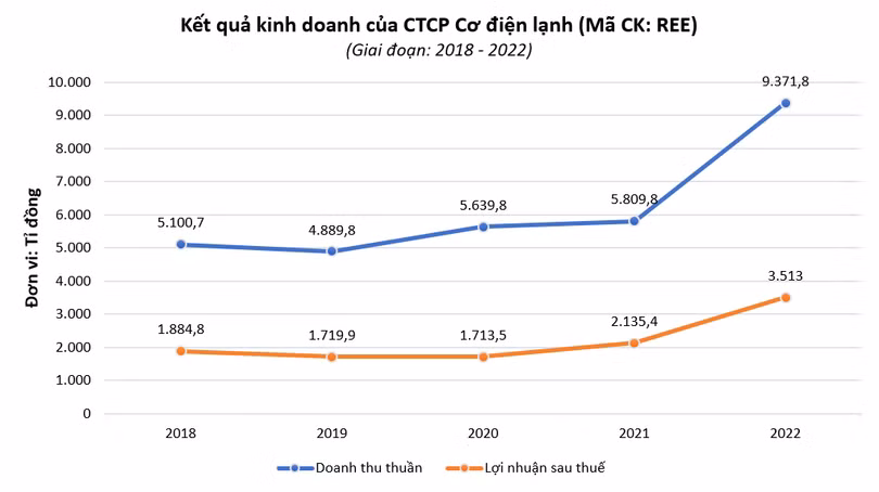 Lũy kế cả năm 2022, doanh thu thuần và lợi nhuận sau thuế của REE đạt lần lượt 9.371,8 tỉ đồng và 3.513 tỉ đồng, tăng lần lượt 61% và 65% so với thực hiện năm 2021, đồng thời vượt lần lượt 1% và 70% so với kế hoạch.