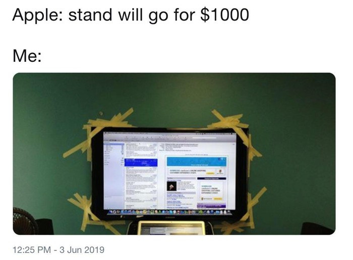 Một người dùng nghĩ ra cách dán màn hình Apple lên tường mà không phải bỏ ra 999 USD hoặc 199 USD để mua chân đế của Apple. Ảnh: Twitter.