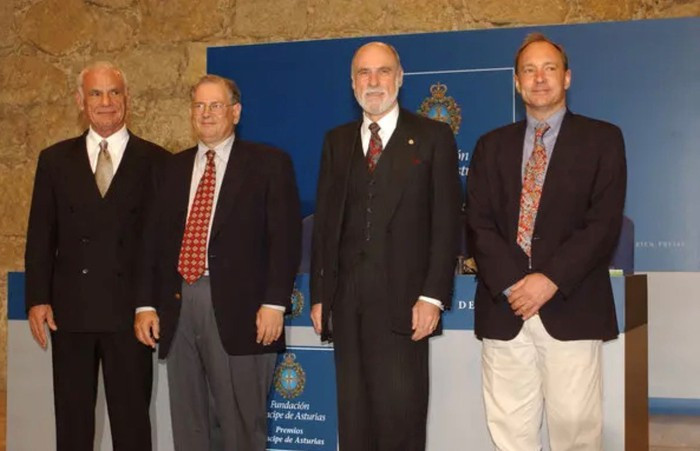 Larry Roberts (ngoài cùng, bên trái) cùng với những người đã đi tiên phong để tạo nên Internet, từ trái qua gồm Robert Kahn, Vinton Cerf và Tim Berners-Lee. Hình ảnh được chụp khi các ông dự hội nghị tại Tây Ban Nha năm 2002. Ảnh: Getty Images.