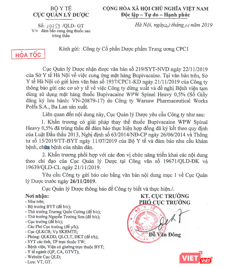 Cục Quản lý Dược cho biết, Cục đã nhận được văn bản của Sở Y tế Hà Nội về việc cung ứng mặt hàng thuốc Bupivacaine. Theo đó, Sở Y tế Hà Nội có gửi kèm văn bản của Công ty Dược phẩm Trung ương CPC1 gửi các cơ sở y tế thông báo về việc Công ty dừng xuất và đề nghị các bệnh viện tạm thời sử dụng thuốc Bupivacaine WPW Spinal Heavy 0,5% (Số giấy đăng ký lưu hành:VN-20879-17) do Công ty Warsaw Pharmaceutical Works Polfa S.A., Ba Lan sản xuất.