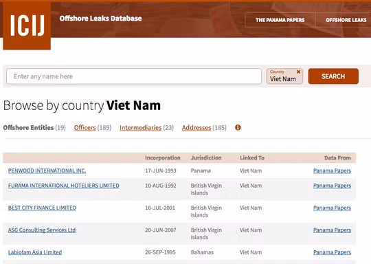 Đáng chú ý, trong số các tài liệu đã được công khai trên trang offshoreleaks.icij.org Việt Nam có khoảng 189 cá nhân, 19 công ty offshore và 23 công ty trung gian.