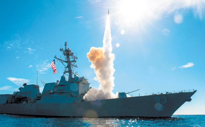 USS Mobile Bay là tàu tuần dương tên lửa dẫn đường lớp Ticonderoga, được biên chế năm 1987, lượng giãn nước 9.700 tấn, tốc độ 32,5 hải lý. Với tên lửa và pháo bắn nhanh, Mobile Bay có khả năng đánh bại mối đe dọa trên không, trên biển, trên bờ và dưới biển. Ảnh: US Navy